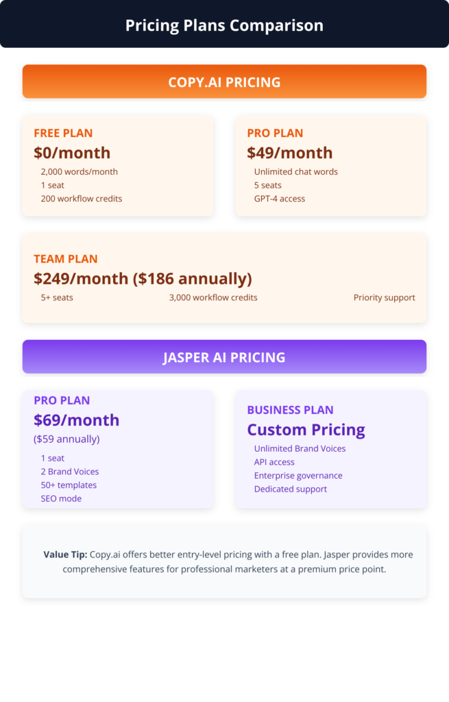 | Best Value for Money | Copy.ai | More affordable starting price and includes free-forever plan |