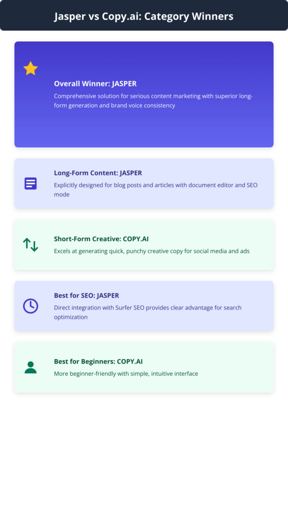 | Overall Winner | Jasper | Offers more comprehensive solution for serious content marketing with superior long-form content generation, brand voice consistency and valuable integrations like Surfer SEO |